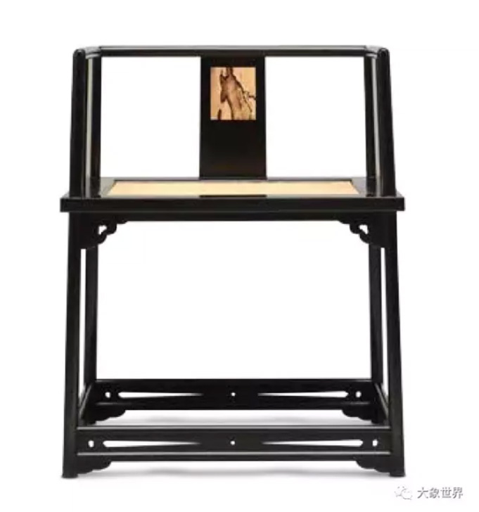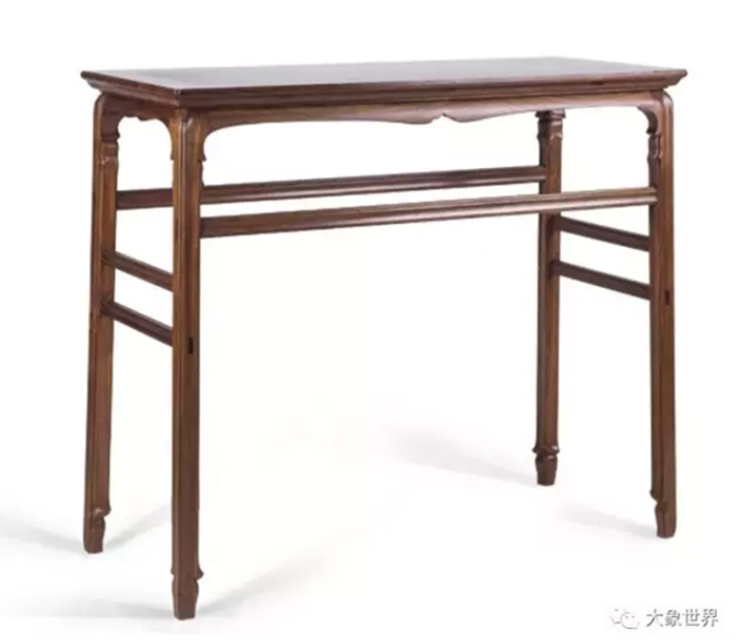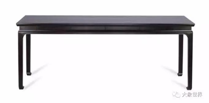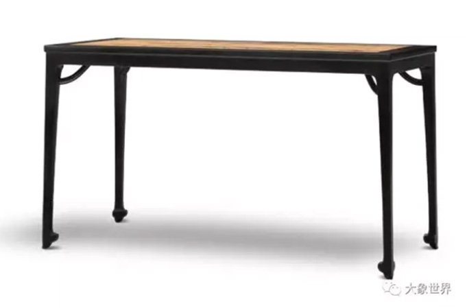 This one is a variant of traditional rectangular desks. It attracts people’s attention to its upper part through a change in its form, with the ruyi (cloud) pattern on its feet to balance the upper part. The desktop is made of Ziricote, on which black dots are scattered among black strips just like the ice melts in a pond in spring. What an ingenious design!